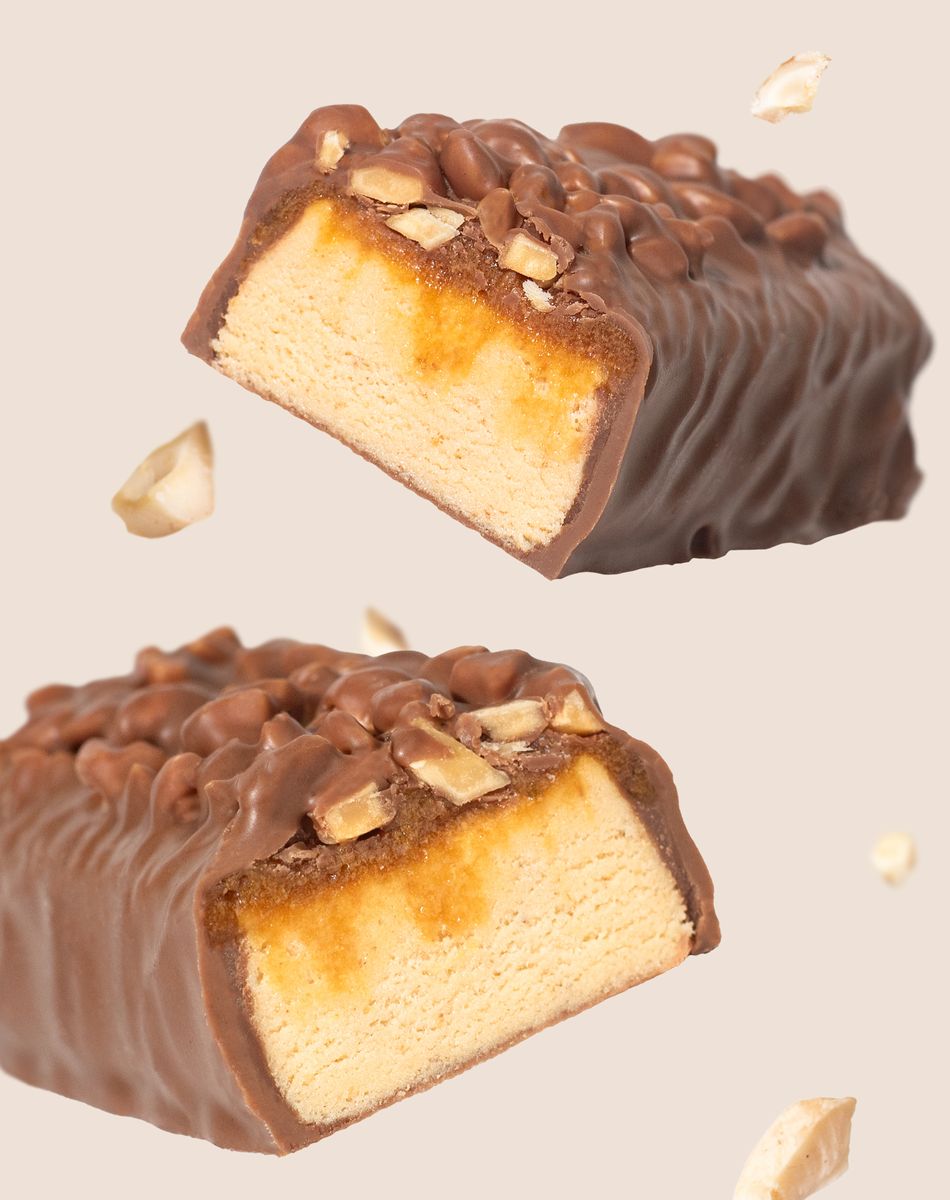 Proteinriegel in Milchschokolade, mit Karamell und Erdnüssen. Lebensmittel mit Zucker und Steviolglykosiden.
